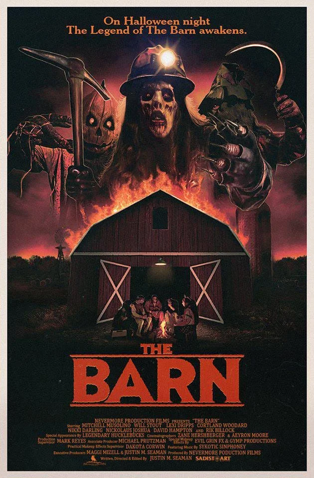 The Barn --- Definitely not one for the kiddies, writer/director Justin M. Seaman’s eighties homage to slasher and monster movies hits the right tones much more so than most attempts at recreating that halcyon era when drive-in theater fare was being eclipsed by direct-to-VHS (not to forget about Betamax) titles that would later become legendary for either their strengths, ineptitude, corniness, or other charms. High school senior Sam (Mitchell Musolino) is a big fan of Halloween, with his own set of rules for the holiday. He and his buddy Josh (Will Stout) talk a group of friends into going to a Halloween concert. On the way, however, they accidentally run afoul of a local curse and unleash three monsters: The Boogeyman, Hollow Jack, and the Candy Corn Scarecrow. This mistake results in bucket-loads of grue and gore.
