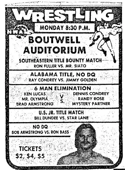 June 1, 1981 (Birmingham, AL): Ray Candy verses Bob Owens... Mr. Olympia (Jerry Stubbs) verses Stan Lane... Jimmy Golden defeated Ken Lucas to win the NWA Alabama title... Dennis Condrey & Randy Rose verses Bob & Brad Armstrong in a No DQ match... Ron & Robert Fuller verses Ron Bass & Mr. Saito... 16 man tag elimination match for $10,000 and trophy.