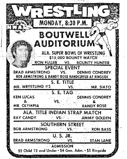 June 22, 1981 (Birmingham, AL): Ron Fuller verses The Bounty Hunter (unknown) in a bounty match... Brad Armstrong verses Dennis Condrey... Mr. Wrestling II (Johnny Walker) verses Mr. Saito... Ken Lucas & Mr. Olympia (Jerry Stubbs) verses Dennis Condrey & Randy Rose... Ray Candy verses Jimmy Golden in an Indian Strap match... Bob Armstrong verses Ron Bass in a Southern Street Fight... Brad Armstrong verses Stan Lane.