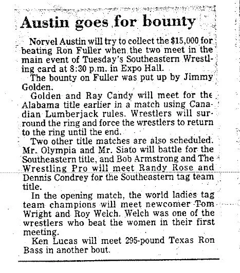 June 30, 1981 (Mobile, AL): Ron Fuller verses Norvell Austin in a bounty match... Jimmy Golden verses Ray Candy in a Canadian lumberjack match... Mr. Olympia (Jerry Stubbs) verses Mr. Saito... Bob Armstrong & The Wrestling Pro (Leon Baxter) verses Dennis Condrey & Randy Rose... Joyce Grable & Judy Martin verses Tommy Wright & Roy Lee Welch... Ken Lucas verses Ron Bass.
