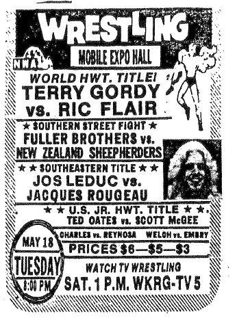 March 18, 1982 (Mobile, AL) (Expo Hall): NWA World heavyweight champion Ric Flair verses Terry Gordy... Ron & Robert Fuller verses New Zealand Sheepherders (Jonathan Boyd & Luke Williams)... Jos LeDuc verses Jacques Rougeau... Ted Oates verses Scott McGhee... Tony Charles verses Juan Reynosa... Roy Lee Welch verses Eric Embry.