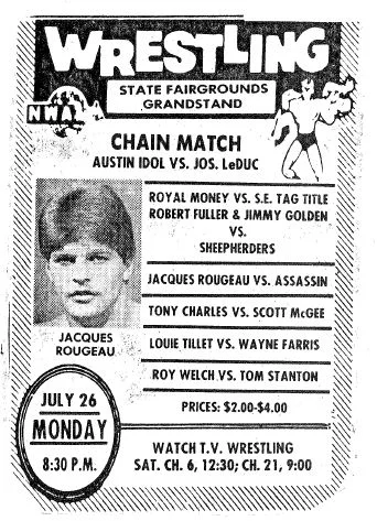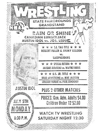 July 9, 1982 (Tallahassee, FL) (Sports Stadium): Jos LeDuc verses Austin Idol... New Zealand Sheepherders (Jonathan Boyd & Luke Williams) verses Robert Fuller & Jimmy Golden... Jacques Rougeau verses Wayne Farris... Roy Lee Welch verses Crusher Verdu.