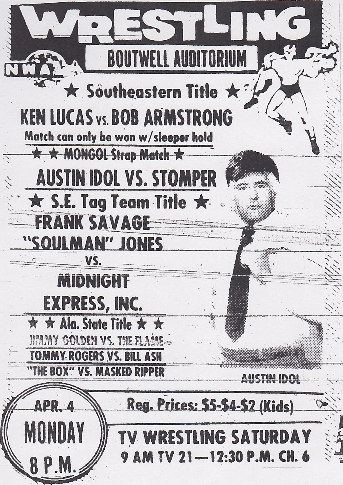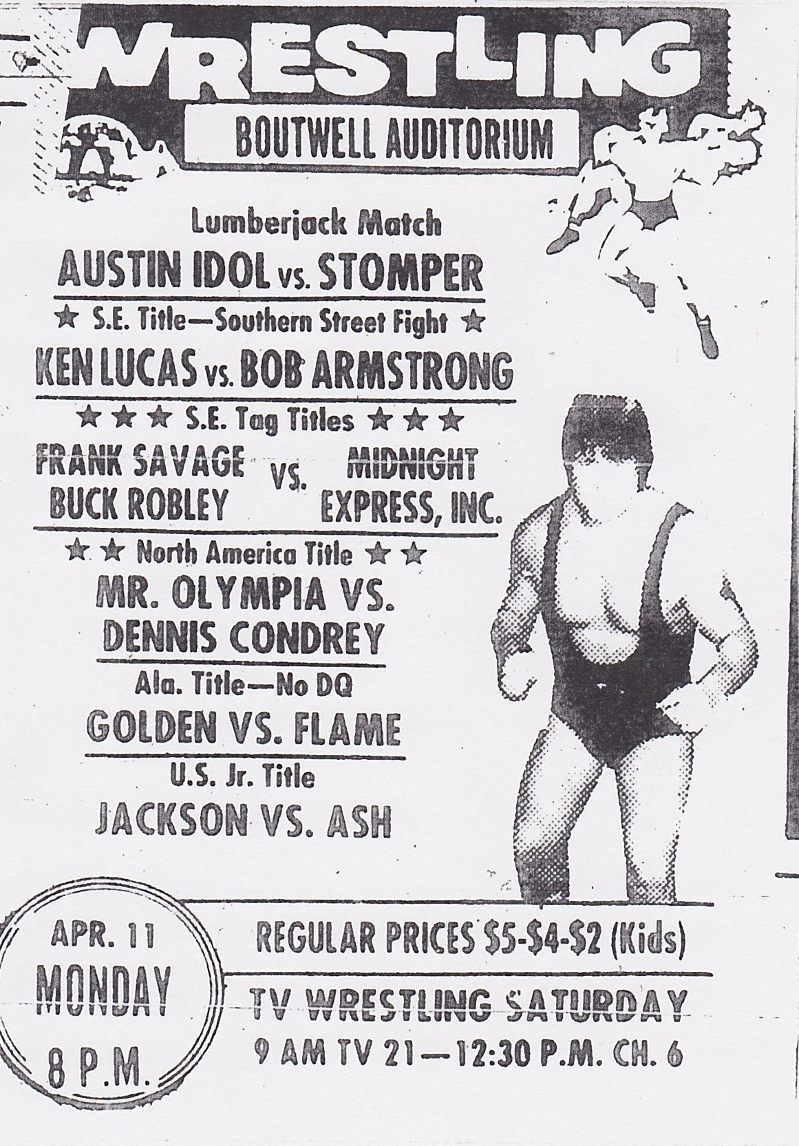 April 11, 1983 (Birmingham, AL) (Boutwell Auditorium): Bill Ash defeated Mike Jackson... Dennis Condrey defeated Tom Jones... The Flame (Jody Hamilton) battled Jimmy Golden to a double count out... Bob Armstrong defeated Ken Lucas to win the NWA Southeastern title... Midnight Express (Norvell Austin & Randy Rose) defeated Buck Robley & Frank Savage... Mongolian Stomper battled Austin Idol to a no contest.