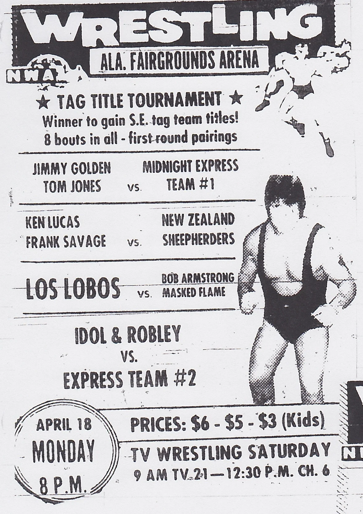 April 18, 1983 (Birmingham, AL) (Alabama Fairgrounds Arena): NWA Southeastern tag team title tournament: Jimmy Golden & Soulman Tom Jones verses Midnight Express... Ken Lucas & Frank Savage verses New Zealand Sheepherders (Jonathan Boyd & Luke Williams)... Los Lobos (Probably Rick "Black Bart" Harris & Cyclone Negro) verses Bob Armstrong & The Flame (Jody Hamilton)... Austin Idol & Buck Robley verses Midnight Express.