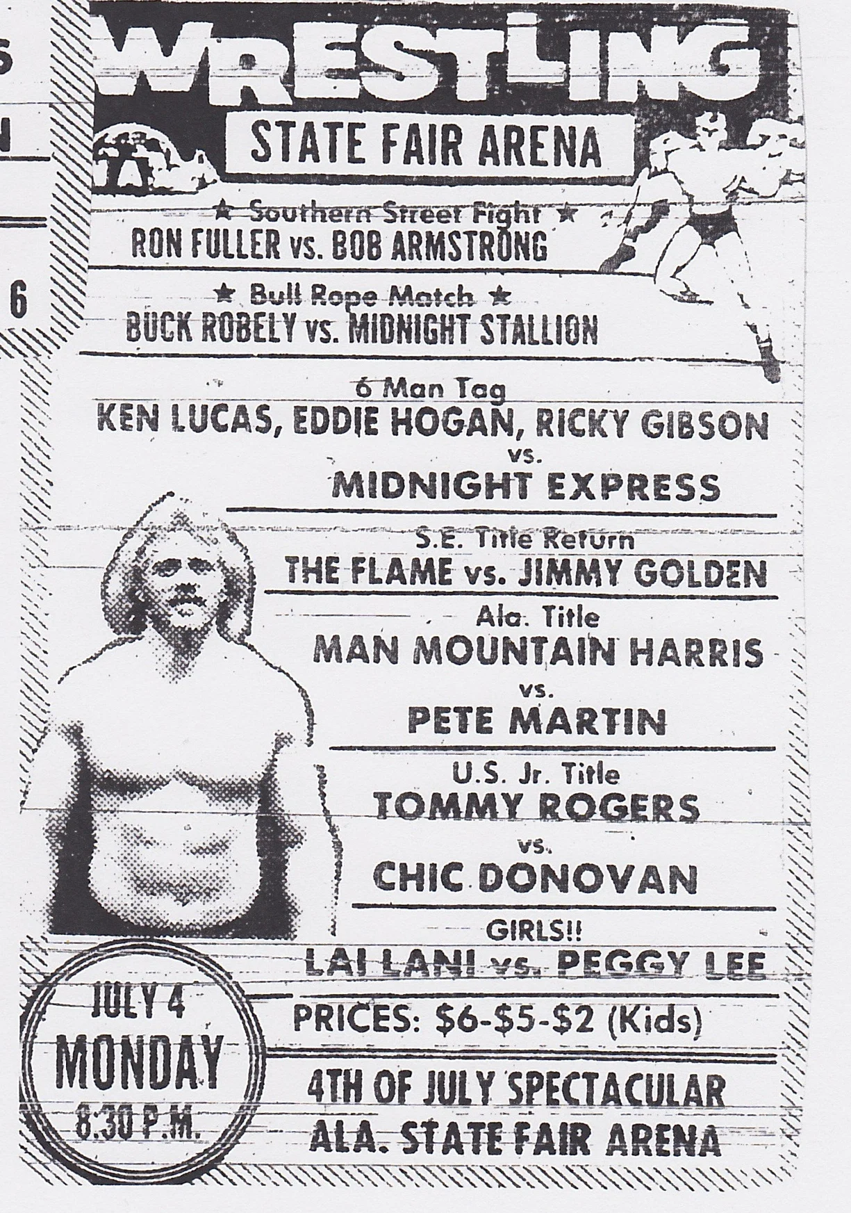July 18, 1983 (Birmingham, AL) (Alabama State Fairground Arena): Ron Fuller verses Bob Armstrong lights out no referee match... Ken Lucas & Eddie Hogan & Ricky Gibson verses Midnight Express (Dennis Condrey & Randy Rose & Norvell Austin)... Jimmy Golden verses The Flame (Jody Hamilton)... Buck Robley verses Man Mountain Harris (AKA - Black Bart)... Midnight Stallion (Mongolian Stomper) verses Bob Owens for the Brass Knux title... Tommy Rogers verses Chic Donovan