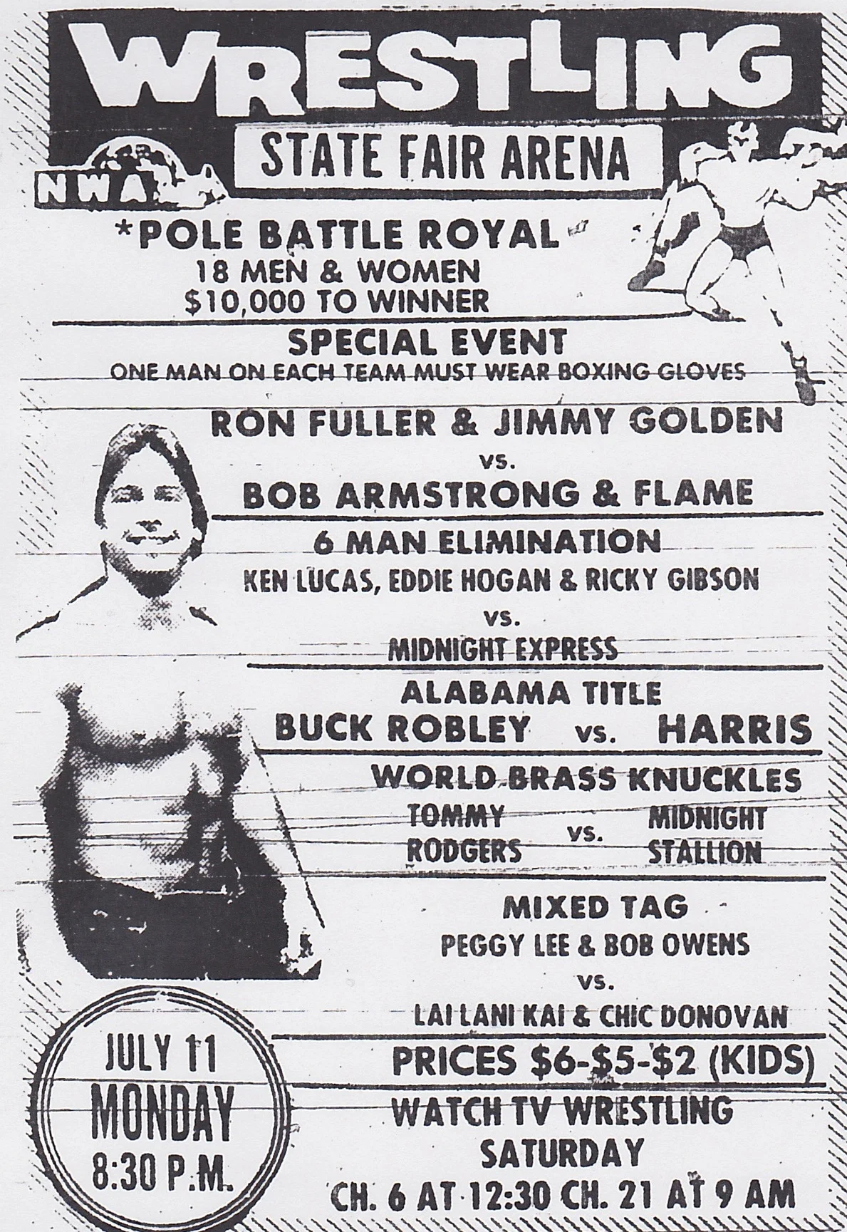 July 11, 1983 (Birmingham, AL) (Alabama State Fairground Arena): Pole battle royal... Ron Fuller & Jimmy Golden verses Bob Armstrong & The Flame (Jody Hamilton) one member of each team must wear boxing gloves... Ken Lucas & Eddie Hogan & Ricky Gibson verses Midnight Express (Dennis Condrey & Randy Rose & Norvell Austin)... Buck Robley verses Man Mountain Harris (AKA - Black Bart)... Tommy Rogers verses Midnight Stallion (Mongolian Stomper) Brass Knux title match... Mixed tag team match: Peggy Lee Leather & Bob Owens verses Lai Lani Kai & Chic Donovan.