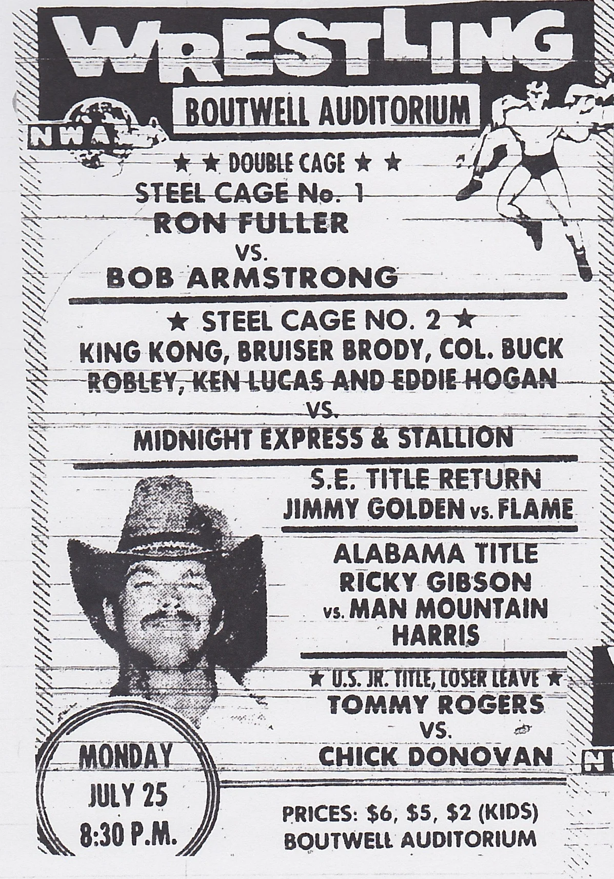 July 25, 1983 (Birmingham, AL): Ricky Gibson defeated Man Mountain Harris (Ricky Harris - AKA: Black Bart)... Chic Donovan defeated Tommy Rogers... Jimmy Golden defeated The Flame (Jody Hamilton - AKA: The Assassin) by DQ... Bob Armstrong defeated Ron Fuller in a steel cage... Bruiser Brody & Eddie Hogan (Ed "Brutus Beefcake" Leslie) & Ken Lucas & Buck Robley defeated Midnight Express (Dennis Condrey & Randy Rose & Norvell Austin) & Midnight Stallion (Mongolian Stomper).