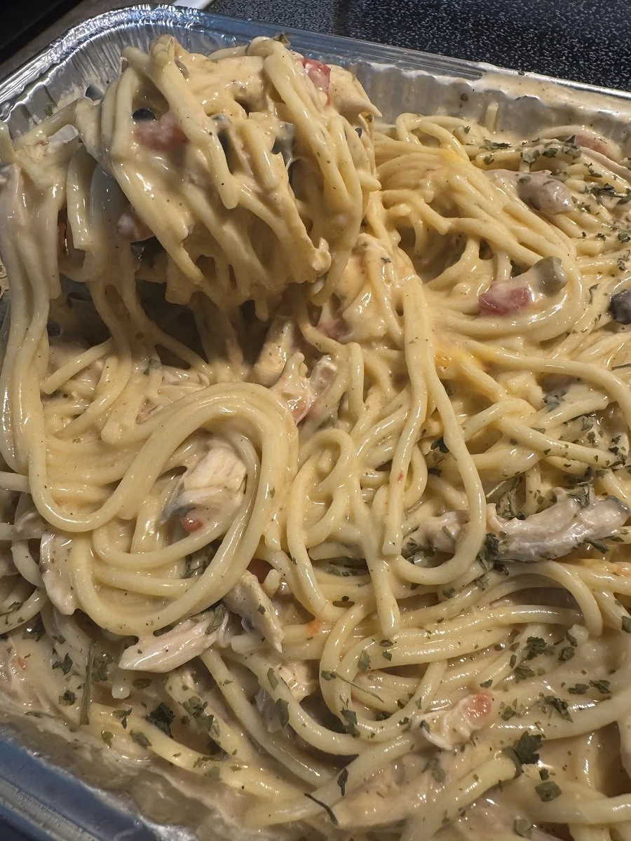 Add the shredded chicken, cooked spaghetti, 2 cups of cheddar cheese, and mozzarella. Toss until everything is coated in the sauce.